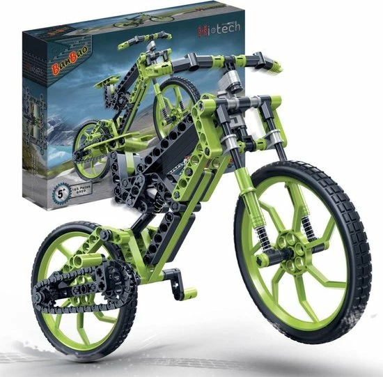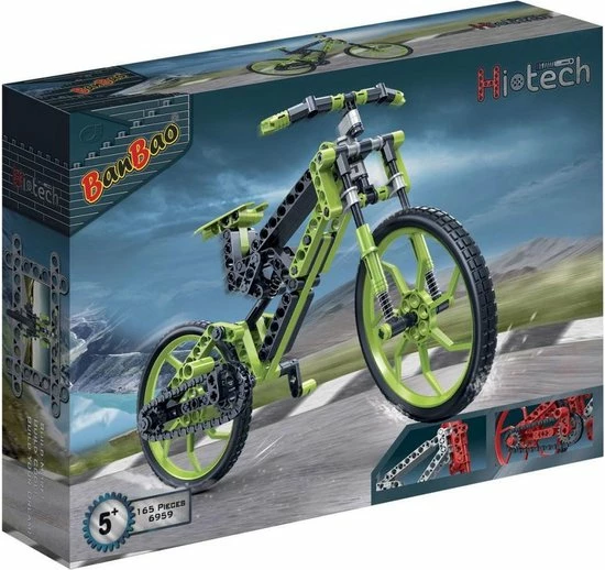 De BanBao High-Tech fiets heeft als enorm voordeel zijn behendigheid. De grote stevige wielen en uitzonderlijke vering maken deze stoere fiets geschikt voor elk terrein. Ga daar waar een normale racer niet kan komen en manoeuvreer behendig over de meest kleine paadjes! Bouw deze Crossfiets met de bouwstenen van Banbao. De fiets is een van de acht unieke producten van de High-Tech serie van BanBao met elk unieke en leuke eigenschappen. Deze speelset bestaat uit een supergave Fiets.