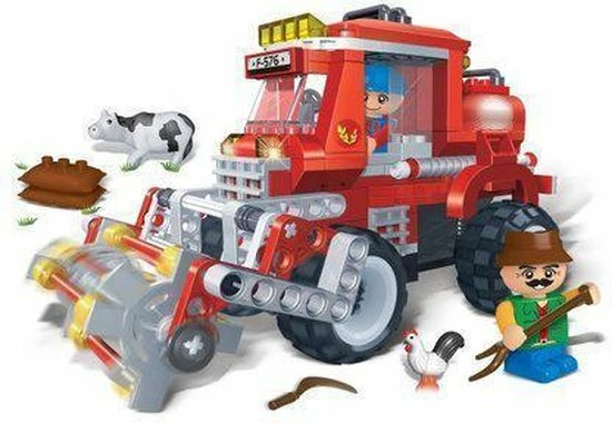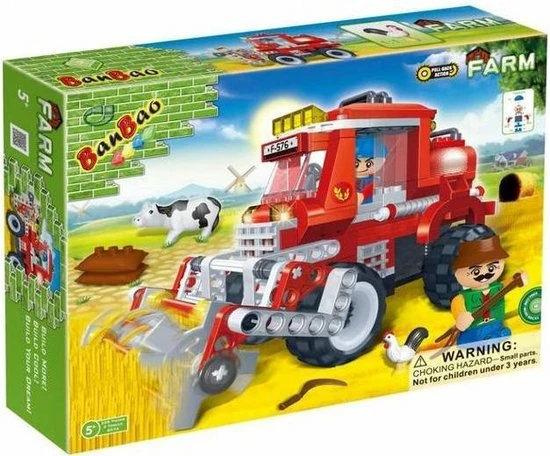 De BanBao Oogstmachine – 8576 uit de Boerderij serie bestaat uit maar liefst 228 blokjes. In de doos zit een oogstmachine, 2 poppetjes, een koe, een kip en andere boerderij accessoires.