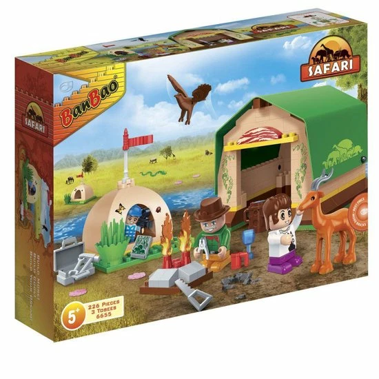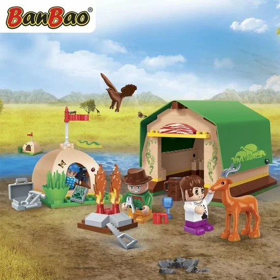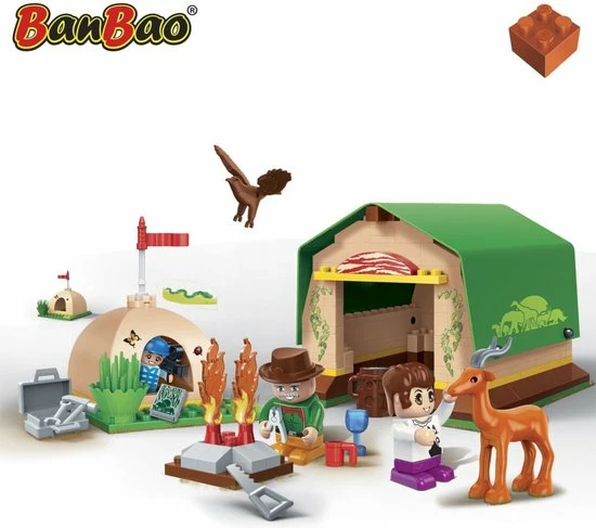 Met het BanBao tentenkamp kun lekker in de wildernis kamperen, omringd door wilde dieren. Als eerste moet het kamp worden gebouwd en moet je hout zoeken om een kampvuur te maken. Terwijl je op zoek bent naar droog hout in het bos, hoor je geluiden van wilde dieren. Maar wat is dat? Een grote adelaar vliegt recht langs je hoofd! Dat is eng. Terug bij de tent wil iedereen spannende verhalen rond het kampvuur horen. Na een nacht vol spannende verhalen en plezier, is het tijd om in een warme slaapzak te kruipen en in slaap te vallen! Bouw deze speelgoedset en maak een kampvuur met de BanBao bouwstenen. Speel met de wilde dieren of de poppetjes (Tobees) rond het kampvuur. Deze set bestaat uit twee safaritenten, drie Tobees, één antilope, één adelaar, één camera, één voerbak, gereedschap en nog veel meer.