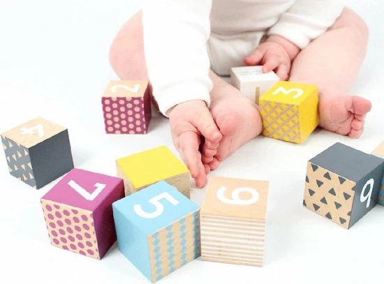 Deze lichte houten blokken hebben mooie heldere kleuren en verschillende patronen. Jonge kinderen ontwikkelen hun fijne motoriek door de blokken te stapelen. Spelen met de cijferblokken is ook een leuke manier om kinderen te leren tellen als ze wat ouder zijn.