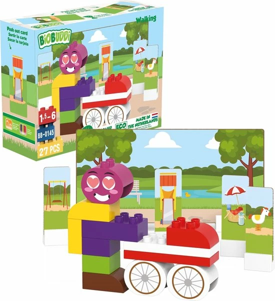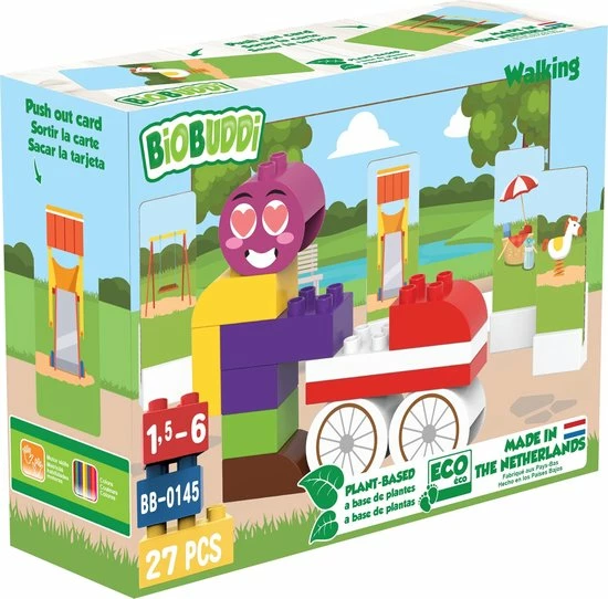 Neem de kinderwagen en neem een tripje naar het park of de speeltuin. Moedig peuters aan om hun emoties op een leuke en inspirerende manier te ontdekken met onze karakters! Peuters kunnen verschillende personages, dieren en huizen bouwen. Waarmee ze hun eigen unieke verhaallijn creëren terwijl ze hun emoties herkennen en leren te begrijpen. De nieuwe speellijn karakters bestaat uit 4 unieke sets. Alle vier de modellen zijn gemakkelijk op te bouwen. De speelset Walking bestaat uit 27 verschillende onderdelen, waaronder kleurrijke bouwstenen die uitwisselbaar zijn met de blokken van andere merken. Maar ook uitdrukkaartjes, kaarthouders en blokjes om alles op zijn plaatst te houden. En ben je uitgespeeld met de set dan bouw je gewoon je eigen nieuwe creatie op. Er zijn oneindige mogelijkheden met de bouwstenen. BiOBUDDi ontwikkelt veilig en educatief speelgoed voor peuters en kleuters. De speelgoedblokken zijn special ontwikkeld voor kleine kinderen om mee te spelen. Bouwen met blokken is goed voor de ontwikkeling van motorische, cognitieve en creatieve vaardigheden. De set stimuleert de leerzame ontwikkeling van het kind. Het speelgoed wordt geproduceerd in Nederland en is niet schadelijk voor het milieu. Het product en de verpakking zijn juist duurzaam en recyclebaar, door gebruik van FSC karton en milieuvriendelijke bouwblokken gemaakt van de suikerrietplant.