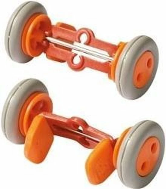 Deze twee oranje wielklemmen van Haba passen goed onder bouwblokken van Haba en bij de knikkerbanen van Haba.
