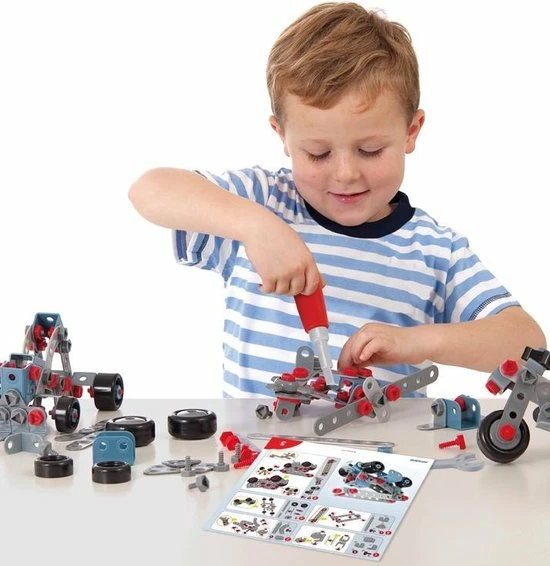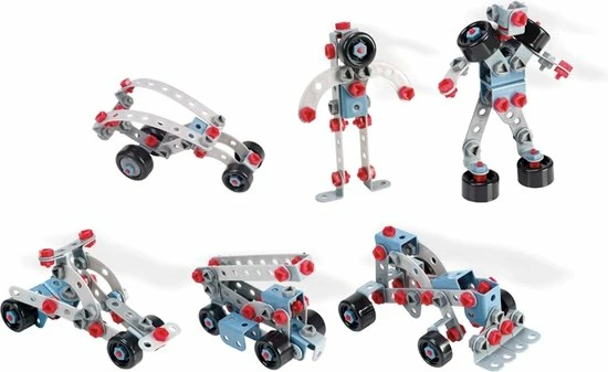 Bouw mechanische constructies met meerdere montage mogelijkheden. De kwalitatieve materialen en grote en duidelijke instructiepagina’s maken het gemakkelijk om de modellen stap voor stap na te maken. De set bevat verschillende formaten van flexibele plaatjes, pennen, assen, bouten en moeren, en diverse wielmaten.