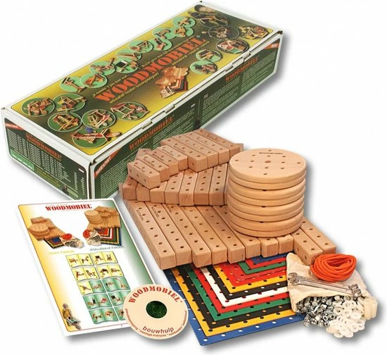 Het pakket bevat 26 houten balken in verschillende maten, 4 houten wielen, 13 kleurrijke HDPE-kunststofplaten, echte stalen dopmoeren en bouten, nylon ringen en lagers, ring-steeksleutels, touw en de handleiding met vele voorbeelden.